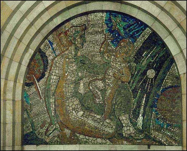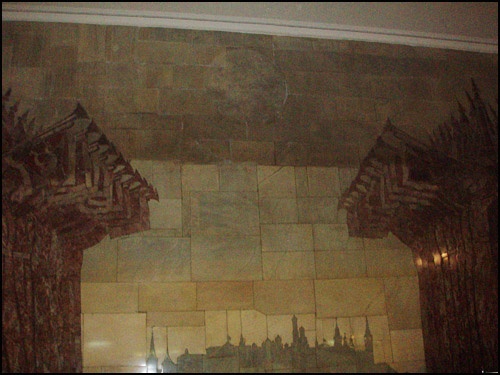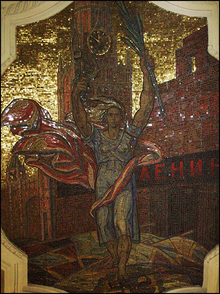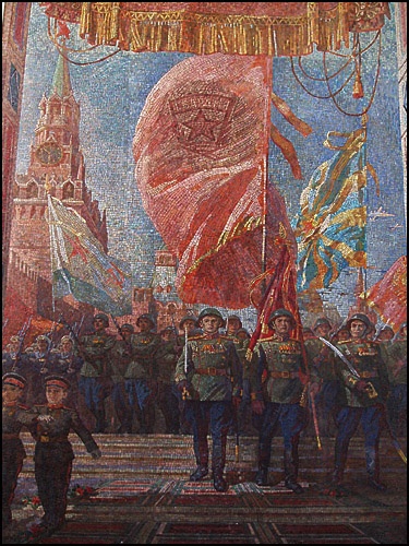 Тут самая занятная история. Первоначально два последних мозаичных панно, «Вручение гвардейского знамени» и «Парад Победы», выполненные великим художником Павлом Кориным, выглядели так: на первом из них изображен Сталин, передающий знамя солдату (за спиной Генералиссимуса стоят его ближайшие сподвижники: Молотов, Берия, Каганович), а на втором — те же персоны из партийной верхушки выстроились на трибуне Мавзолея, у подножия которого брошены фашистские знамена. После того, как товарищ Берия потерял доверие, а товарищ Маленков надавал ему пинков (реальный стишок тех времен, мне друг рассказывал, у которого дед работал когда-то в НКВД), на коринских панно с него бесцеремонно сняли очки. Потом пришла очередь Молотова и других верных соколов. В 1963 году настала пора глобальных перемен: вместо «Вручения гвардейского знамени» появилось «Выступление Ленина перед красногвардейцами, отправляющимися на фронт», а «Парад Победы» превратился в «Триумф Победы». Корин, которому поручили подготовить новые эскизы панно, сделал эту композицию такой, чтобы в нее вошло как можно больше фрагментов прежнего «Парада». С картины просто исчезло все сталинское Политбюро (трибуна Мавзолея теперь оказалась пустой), а на переднем плане появилась аллегорическая фигура: Родина-мать с пальмовой ветвью мира и серпом-молотом.