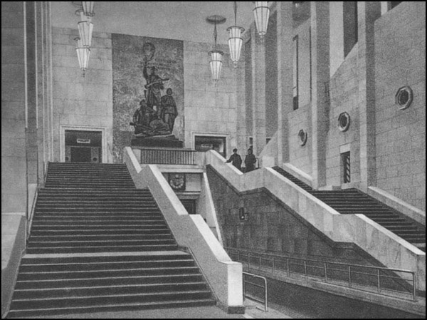 И, наконец, величественная скульптурная группа «Сталин и молодежь» (скульпторы Е. П. Блинова и П. А. Баландин). Впоследствии ее заменили на панно тех же авторов с портретом В. И. Ленина, гербом СССР, союзных республик и изображениями городов-героев Ленинграда, Сталинграда, Севастополя и Одессы. А сейчас там переход на ТКЛ.