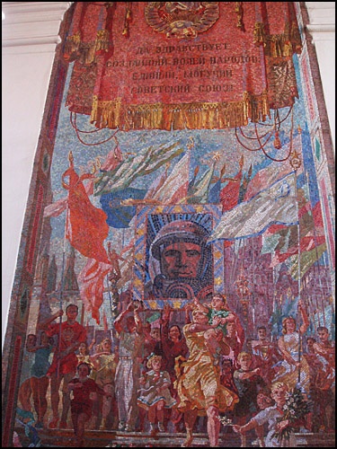 Поглядите на мозаичное панно в наземном вестибюле станции, где изображены ликующие граждане, которые несут портрет первого космонавта, и подумайте. Ничего не кольнуло? Ну так я подскажу. Станция открыта в 1950 году, когда Юрий Гагарин еще был безусым юнцом. Был Сталин и на мозаике слева, но там его убрали как-то совсем топорно: хоть бы смальту подобрали под цвет, а то сразу в глаза бросается, что Гвардейский знак потом вставлен.