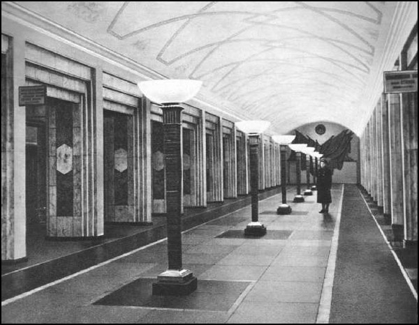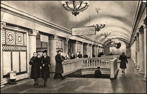 В торце центрального зала этой станции стояла небольшая скульптурная группа в полный рост: Сталин и Ленин. Сначала ее просто убрали, а в семидесятые в этом торце построили переход на ТКЛ.