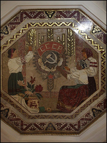 Среди мозаичных плафонов, выполненных во флорентийской технике, был и такой: труженицы села вышивают портрет Сталина. Теперь его место занял орден Трудового красного знамени.