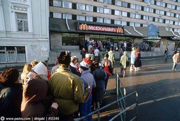 Очередь в Москве в первый Макдоналдс. 1990 год. «Помню ездила с родителями туда пару раз, как раз в 91-м. Тоже стояли до потери пульса… Уставали как не знаю кто, зато счастья до неба) Сейчас — не могу понять, чего ради. И охота была такую громадную очередь стоять ради картошки фри с колой.»