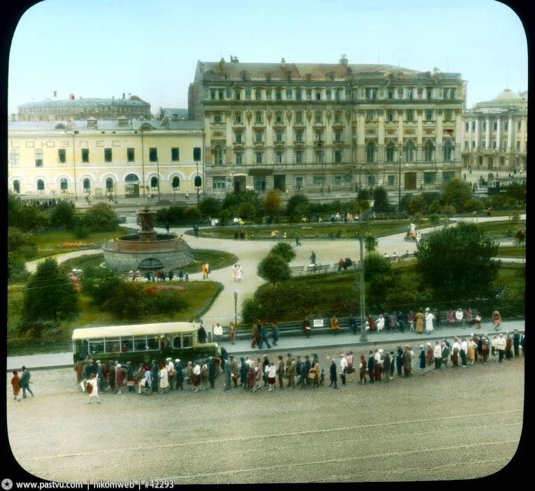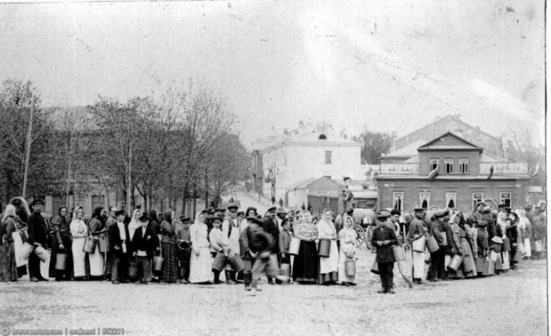 Угол Октябрьской площади и Коровьего вала 1935 год. Очередь за едой.
