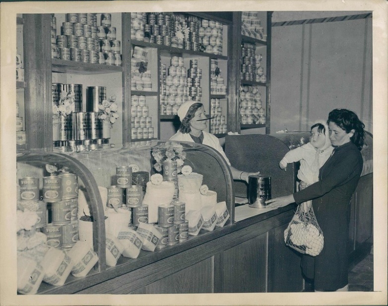Простой продуктовый магазин в городе Минске в июне 1946 г. Все товары произведены в США. Снимок американского фотокорреспондента.
