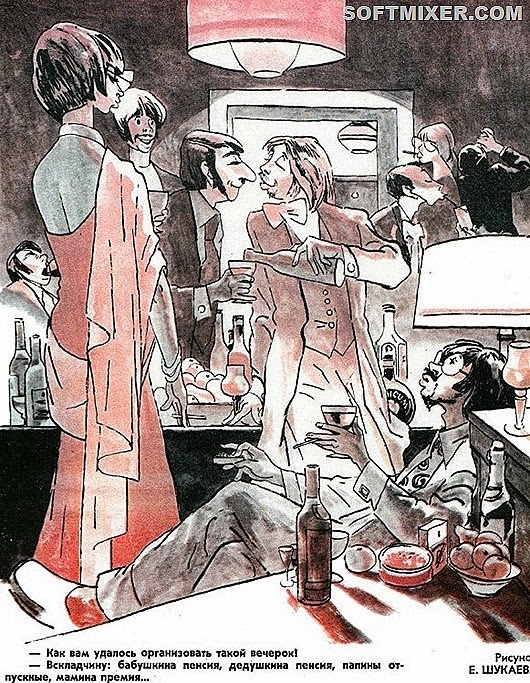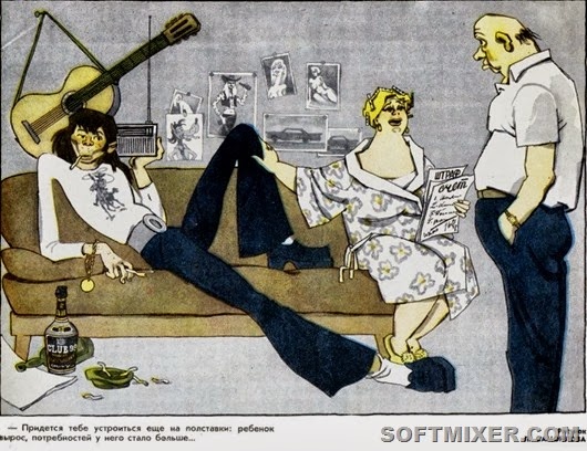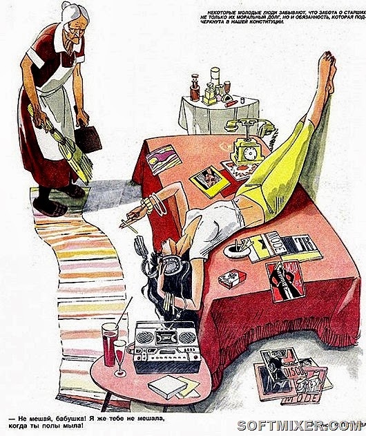 Другой любимый подвид тунеядцев представлял собой молодых людей, живущих за счёт родителей или дедов. Что меня больше всего поражало, так то, что эти карикатурно-фельетонные юноши и девушки умудрялись модно и богато одеваться за счёт… бабкиных пенсий. Да-да. Большое число карикатур обыгрывало ситуацию, когда внучок требует от бабки пенсию на удовлетворение своей базовой потребности, например, на покупку джинсов.