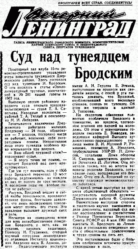 Главным бичом общества стали называть «паразитирующий» образ жизни, то есть тунеядство. Тунеядцами автоматически становились все, кто не работал четыре месяца в году. И за это была предусмотрена уголовная ответственность…