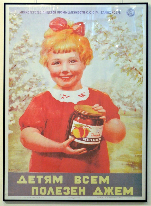 Выставка была очень объемной, представлены рекламные плакаты, объявления, реклама, размещенная на упаковке товара, как и велит товарищ Горошенко. Экспонаты поделены на группы в соответствии с видами упаковки, есть много исторических фактов и описаний предметов, большая вступительная статья — в общем, выставка отлично подготовлена. Фотографий много, поэтому разделю рассказ на две части. В этом посте будет реклама еды, а во втором — реклама НЕ еды :)