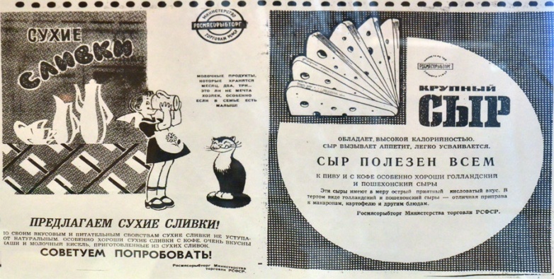 Советская реклама зачастую развивалась в условиях, когда актуальнее было бы сообщать с плакатов «где достать?», а не «что достать?». Так, в Москве в витрине «Гастронома» на Кузнецком мосту под плакатом «Всегда в продаже свежее мясо и рыбные продукты» можно было увидеть искусно выложенную гору консервных банок. Под надписью «Всегда в продаже свежее молоко» («Гастроном» № 40) размещались все те же консервные банки, но уже в виде хитроумных пирамид, а под панно «Обувь к зимнему сезону» («Дом обуви») были «со вкусом» выложены сандалии.