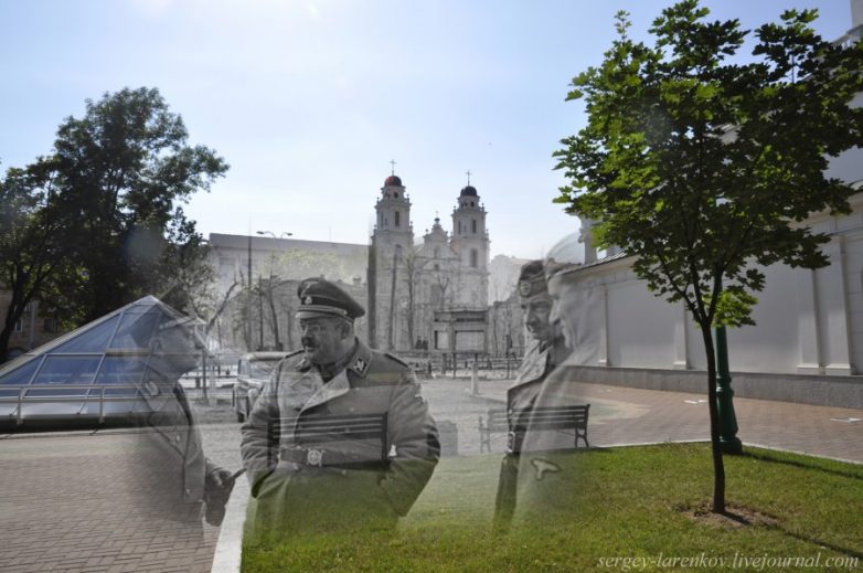 20.Минск 1943-2013 Коллаборационисты у Дома офицеров. Подготовкой движения коллаборационистов для Белоруссии гилеровская Германия занималась еще до войны, когда там было создано так называемое Белорусское правительство. Вместе с немецкими войсками в Минск втянулась и «пятая колонна» из эмигрантов и пленных солдат польской армии белорусского происхождения. Позже формирования коллаборационистов использовались для борьбы с партизанами.