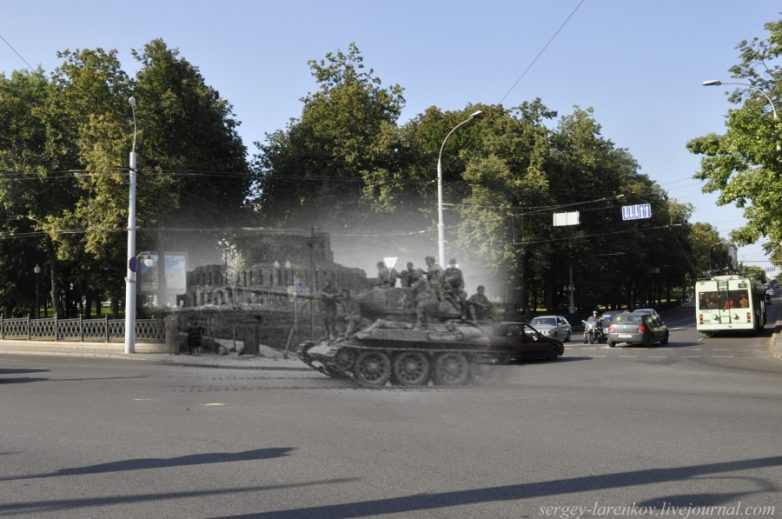 32.Минск 1944-2013 Т-34 на перекрестке ул Куйбышева и Янки Купалы. Из-за листвы почти не видно здание театра.