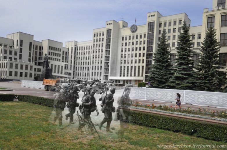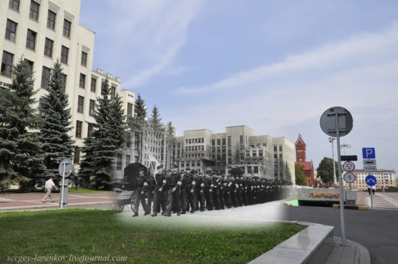 03.Минск 1941-2013 Немецкая пехота проходит по площади Ленина (ныне пл.Независимости) мимо Дома Правительства, построенного в 1934 году по проекту архитектора Лангбарда. Несмотря на то, что город был в большой степени разрушен бомбардировками, зданию удалось устоять. При отступлении в 1944 году немцы заминировали здание, но вовремя подоспевшие подразделения советских саперов успели предотвратить подрыв.
