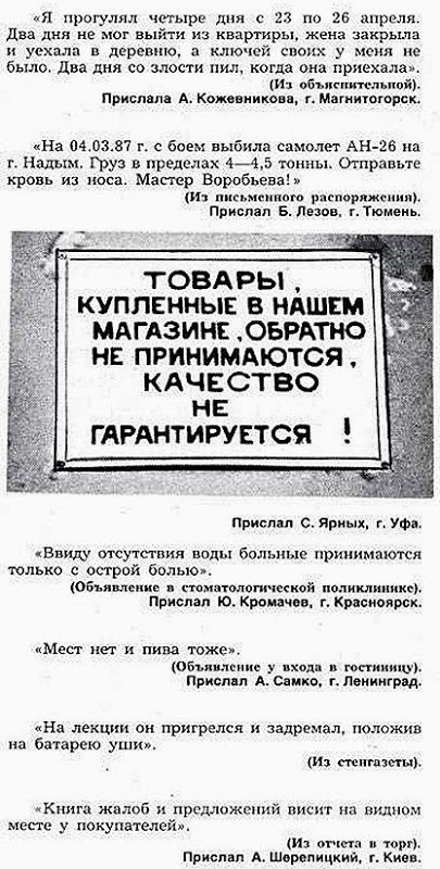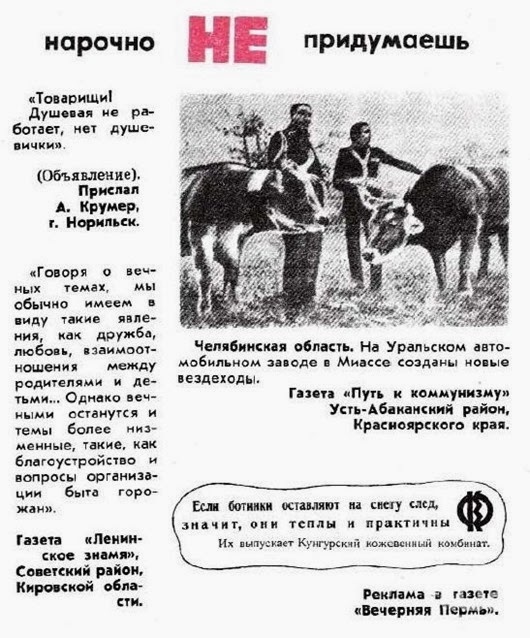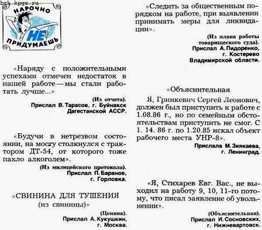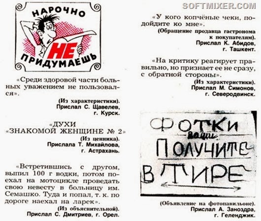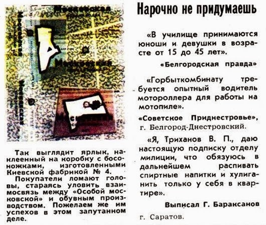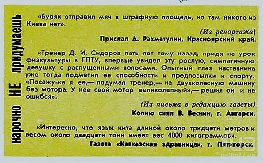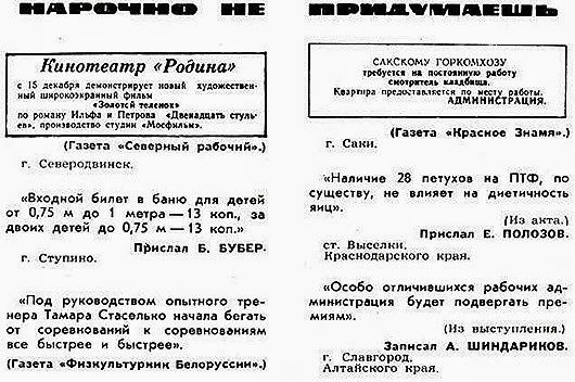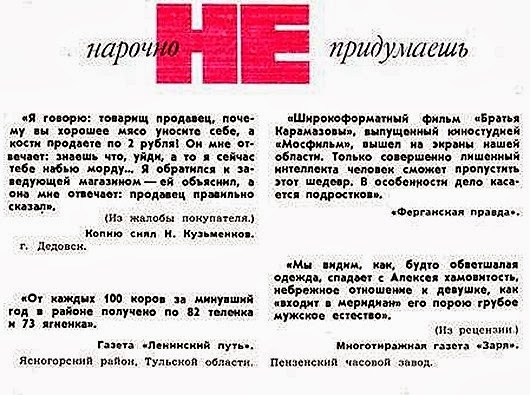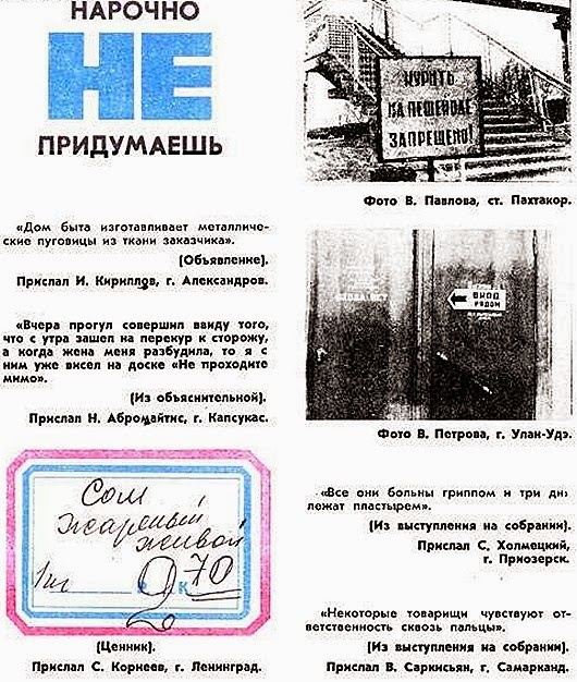 В советском «Крокодиле» был рубрика «нарочно не придумаешь» (она встречалась и во многих других изданиях). Это была самая популярная рубрика не зависевшая ни от идеологического заказа, ни истощенного профессиональными нормами выработки чувства юмора авторов.