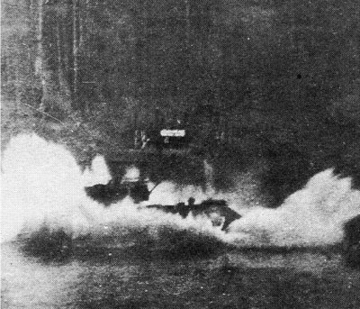 А для этого за считанные мгновения следует четко и быстро выполнить довольно сложную программу. Начать разгон с максимальным ускорением, для чего передачу переключать быстро и при достижении максимальных оборотов двигателя на каждой передаче. Последние 20-30 метров пройти с наивысшей скоростью, несколько задрав нос танка перед самым прыжком. Когда танк отрывался от берега, с двигателя снималась нагрузка, обороты увеличивались, и гусеницы начинали вращаться с бешеной скоростью. Чтобы не потерять их в воздухе, следовало сбросить обороты до максимальных. Удара в любом случае не избежать — танк все-таки не птица! — но так он получится скользящим.