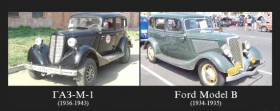 Волга и Форд схожи чисто внешне, как и ГАЗ-М1 и Форд-Б, Симку АЗЛК приказали взять за основу (только кузов), после чего весь переработали, ВАЗ-2103 разрабатывался итальянцами как люксовая модель FIAT-124, а не 125. Кстати, по настоянию наших специалистов переработан кардинально мотор, подвеска и усилен кузов; Москвич с Кадетом не имеют ничего общего, а вот у М-408 и М-412 кузов абсолютно одинаков… Сменили 408 на 412 из-за экспортных требований: «0» в середине забил за сбой Пеугиот… У ЗАЗ и НСУ и ФИАТ абсолютно разная начинка при внешнем сходстве, Для ЗиС-110 Паккард был прототипом: ну нравился он руководству страны, абсолютно разные машины, ГАЗ-А делался по официально купленной лицензии, Москвич-400 создавался заново, на основе немецких образцов, без чертежей… Волга ГАЗ-24 абсолютно оригинальная модель… как и КИМ-10, ЗиЛ-114 и 115 имеют много общего, а вот с Каддилаком и Линкольном ничего общего не имеют, как и ГАЗ-М12 с Бьюиком…