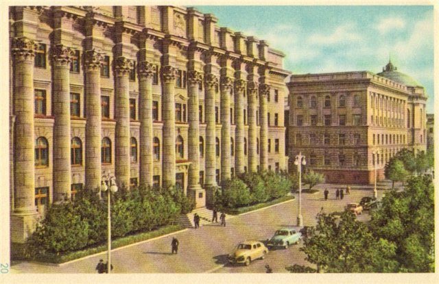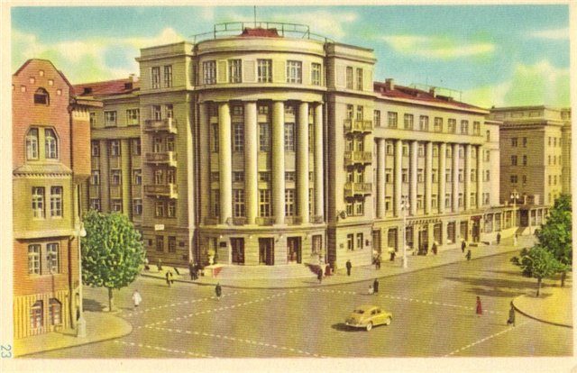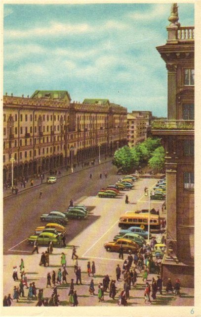 Второе здание справа (с колоннами) — телецентр. Дальше — шпиль. Крайнее слева здание — штаб белорусского военного округа — ныне Министерство обороны.