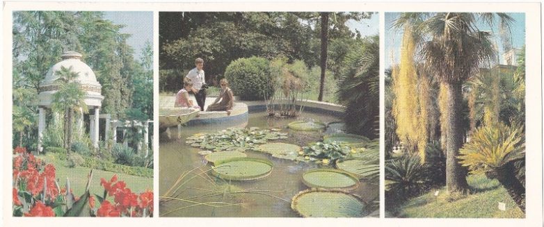 За открытки спасибо, но какие-то они невыразительные. Помню свои первые впечатления, когда попал в Сочи. Это было что-то сродни сказке. Я ещё рано утром приехал. Все спят, улицы пустые, тихо, прохладно. Попадались места, где казалось, что в тропическом лесу находишься. Ан нет. Голову повернул, и сразу какой-нибудь санаторий на глаза лезет. Но архитектура замечательная, хорошо как-то делается на душе. Спокойно и свободно. Хочется улыбаться, быть вежливым, и с удовольствием ощущаешь, что жить — хорошо. Вечером, другое. Все подвыпимши, женщины красивые, везде кафе, ощущения такие будто в злачном месте сидишь. Впрочем, это не только в кафе. Это во всем городе так. Но, интересно. Все время в голову лезет фраза из Шукшина: «Вот так сто лет бы жить и ни одна хворь тебя не тронула бы». Говорят, сейчас там всё по-другому.