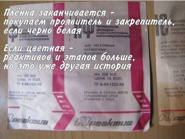 Мать в детстве подарила «Смену-6» (до сих пор на стене висит). Обрадовался, нащелкал снимков. Дальше надо проявлять. А как? Фотик подарили, а руководств нет. Только пакетики с проявителем и закрепителем. Спрашиваю виновницу (маманю). Та поразмышляла недолго и решила: — Налей в бачок сразу и проявитель, и закрепитель. Так и сделал. Новый вопрос: надо крутить в бачке, а сколько? — Покрути минут 20. И я крутил. Зато сколько «радости» было, когда из бачка вытащил… совершенно прозрачную пленку!