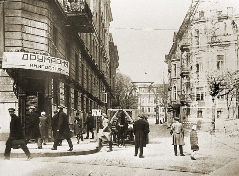На фото (правда, более раннем — 1920-х годов), люди идут по Прорезной, а телега с лошадью выезжает из Музыкального переулка.