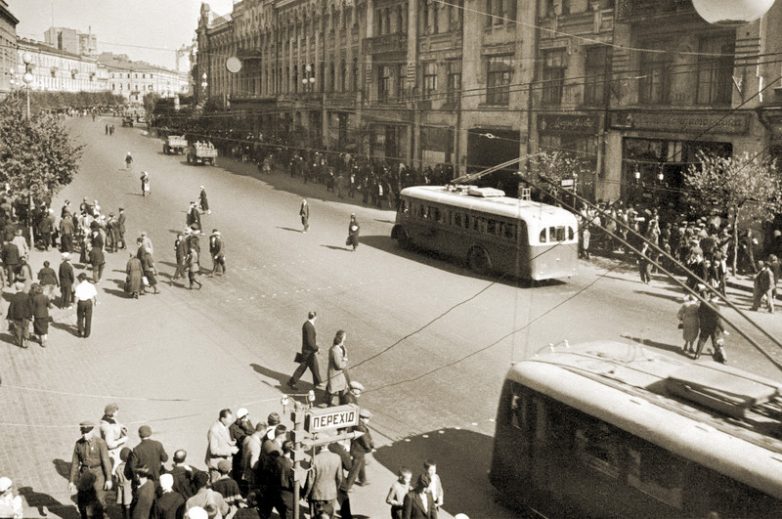 С 1935 года по главной улице вместо старого привычного трамвая начинают ходить троллейбусы. Хотя ни один из этих домов на Крещатике не сохранился, наверняка, любой киевлянин узнает характерный изгиб главной улицы от Прорезной (тогда улица Свердлова) до нынешнего Майдана.