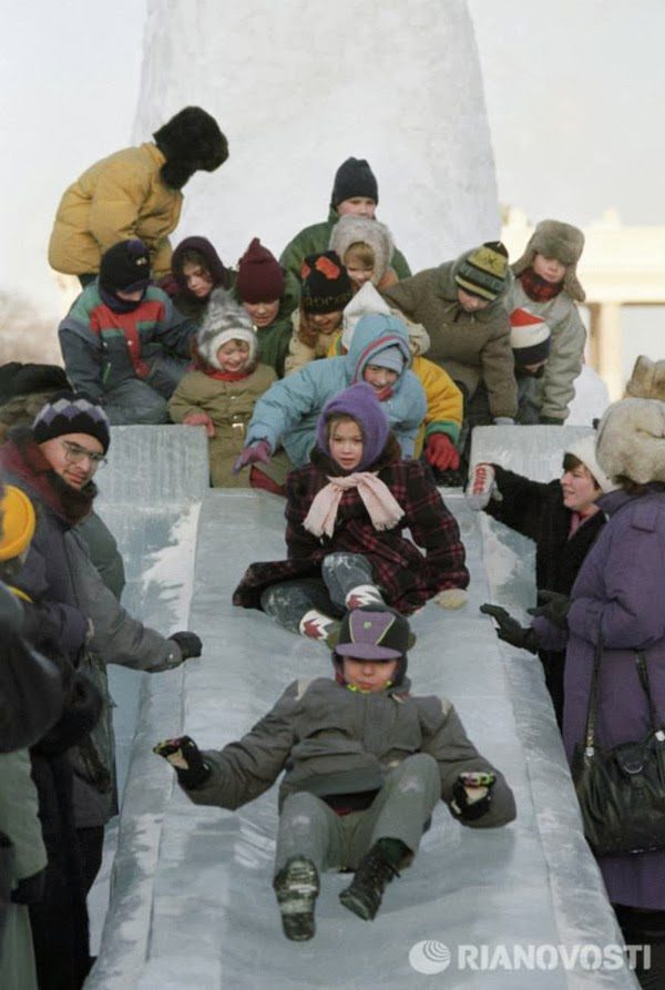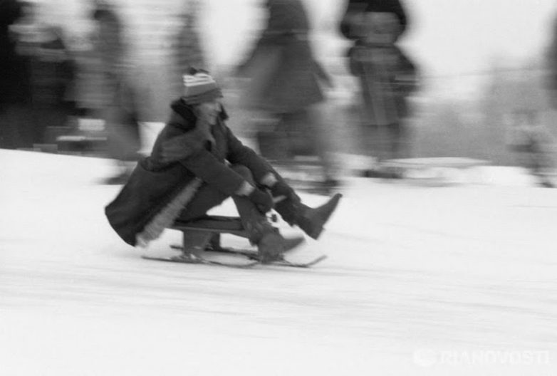 Дети и взрослые катаются на санках с горы в Крылатском, 1990 год, © РИА Новости, Александр Поляков