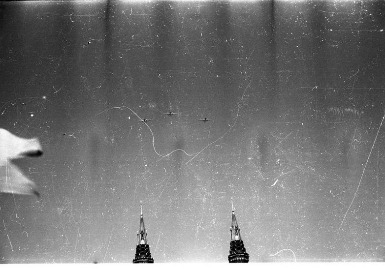 ИЛ-28 заблудились из-за плохих метеоусловий.Один бомбардировщик получил повреждения, а один разбился вместе с экипажем.Сталин И.В.проявил заботу лично о семьях погибших летчиков, несмотря на то, что вина была экипажа.А во время парадов была такая команда: если что случается с самолетом падать в Москву-реку.