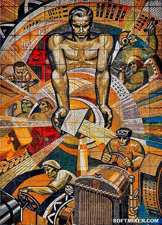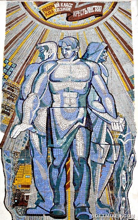 Фасады советских зданий часто украшались мозаиками. Монументальные панно до сих пор сохранились во многих городах бывшего СССР. На них изображались герои труда – космонавты, шахтеры, сталевары, монтажники-высотники, доярки на пути к светлому будущему.