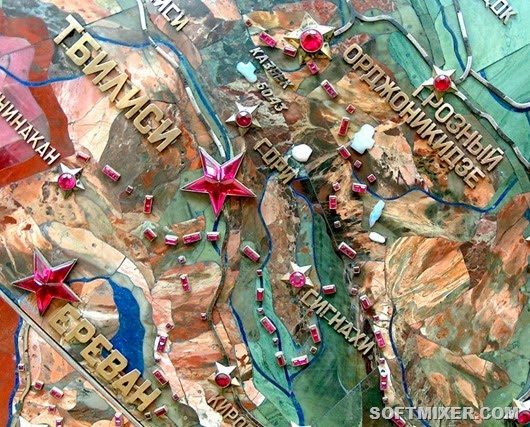 Наверно, самая прекрасная и потрясающая мозаика, которая получила гран-при на всемирной выставке искусств в Париже, и золотую медаль, но уже в Нью Йорке, была и остается карта СССР из самоцветов — «Индустрия социализма». Она выполнена в технике флорентийской мозаики.