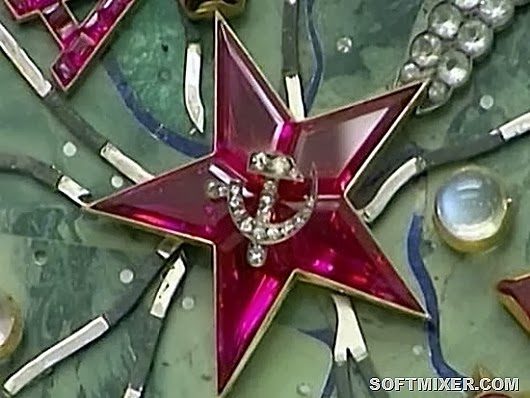 Рядом с картой выставлен еще один великолепный образчик камнерезного искусства –герб СССР, техника исполнения: флорентийская и русская мозаи-ка, резьба по камню, огранка, ювелирные работы, позолота, лепные работы. Материалы: поделочные и ювелирные камни, серебро, алюминий, латунь, текстолит. Диаметр – 130 см. Вес – 200 кг.