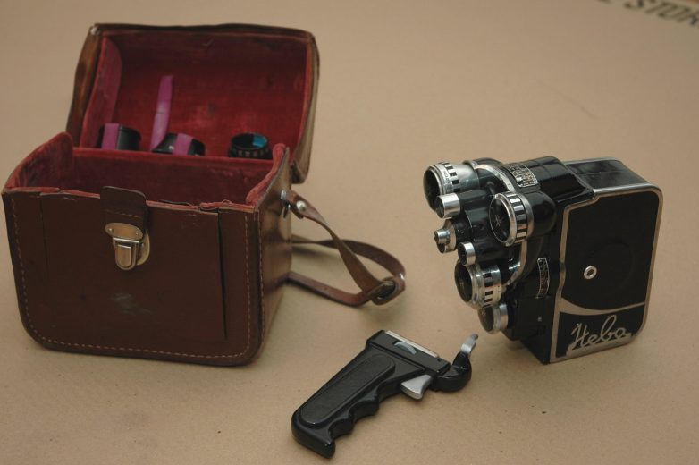 А вот этой кинокамерой дедушка снял сотни метров плёнки — и на даче, и в различных поездках, в том числе на Всемирной выставке в Индии 1961 года, где был в том числе Юрий Гагарин. Зум-объективов тогда не было, поэтому на камере поворотная турель с двумя конверторами — х0,5 и х2, и «пустая» насадка, чтобы снимать объективом со стандартным фокусным расстоянием.