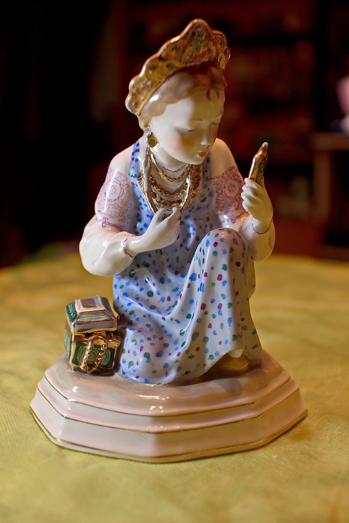Когда я ложился спать в бабушкиной квартире, я всегда видел стоящую высоко-высоко, на платяном шкафу, статуэтку. Больше всего меня интересовал вопрос, настоящее ли зеркальце у девушки. Сам я достать и посмотреть не мог, а бабушка, сколько не спрашивал, не говорила — наверное, тоже не знала…