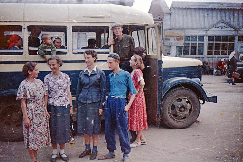 И сатураторные тележки помню, и такие автобусы, и женщин в мужских пиджаках… Еще была манера делать нечто вроде шляпок из наголовных платков… Моду эту завезли к нам немки из Поволжья… Фотография за деревянным забором по архитектуре явно школа… Я еще успела поработать в такой в 1971 в селе после института…