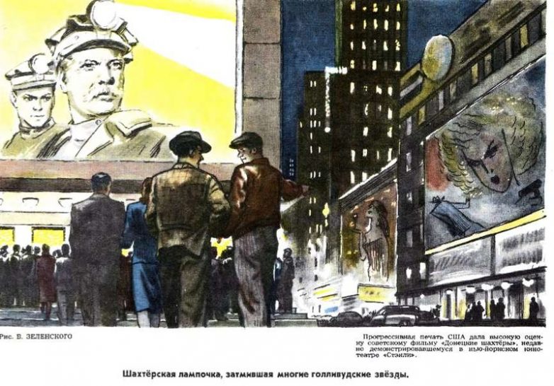 Кстати, фильм «Донецкие шахтёры» почти сразу показали в США и вроде бы даже не без успеха. Вот как этот показ представлял себе художник из советского сатирического журнала «Крокодил»: