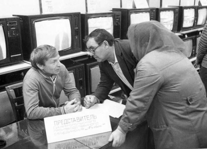Насчёт скотча и пенопласта, по-моему насвистели… скотч в то время не был распространён, всё перевязывали верёвочками, на фабриках коробки собирали при помощи скоб и клея. Внутри были картонные же прокладки. Лиц продавцов особо не помню, у тех, которые были в Ижевске, в магазине «Экран», были обыкновенные, без описанной надмености и кивков… Технику и мебель с магазинов больше возили на санках… летом, конечно было сложнее… Холодильник и диван вывозил на грузовике ТЭА, а вот Вятку пришлось переть самому 10 км на санках, поскольку «после 5-ти машину уже не найдёшь»…