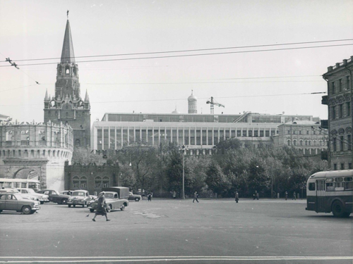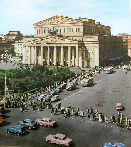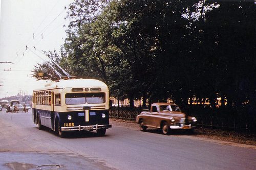 Перед ближайшем троллейбусом грузовик с рекламой (ГАЗ-51), слева от грузовика пикап (Победа), а слева внизу — фургон «Москвич»