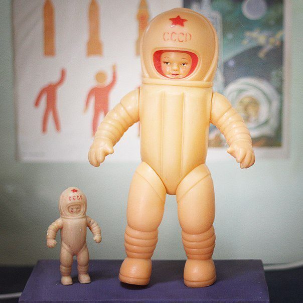 На выставке «Счастливое детство» космонавты и чудо-кукуруза возвращают на полвека назад, бумажные модели мавзолея для склеивания рассказывают о первых годах советской власти, а всем хорошо знакомый олимпийский мишка и беседка советского города-курорта Сочи – словно связывают прошлое с настоящим.