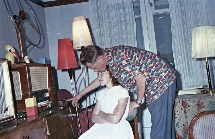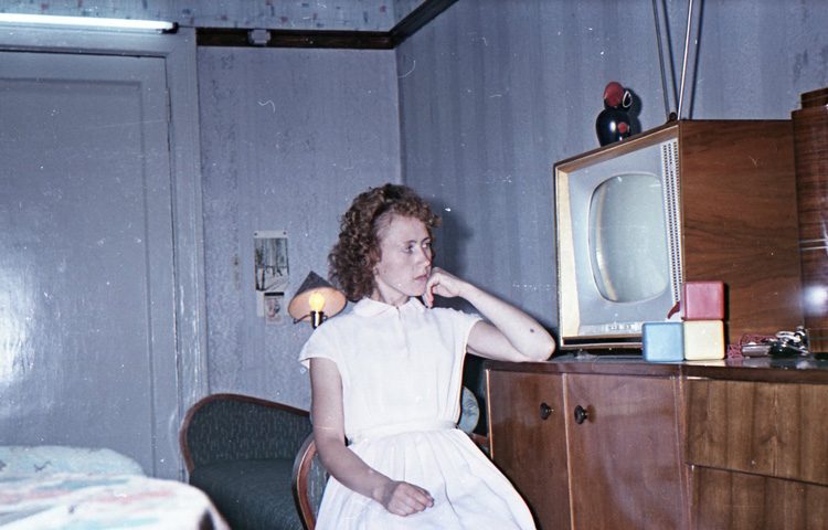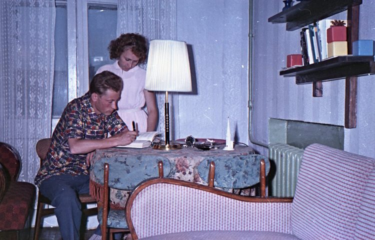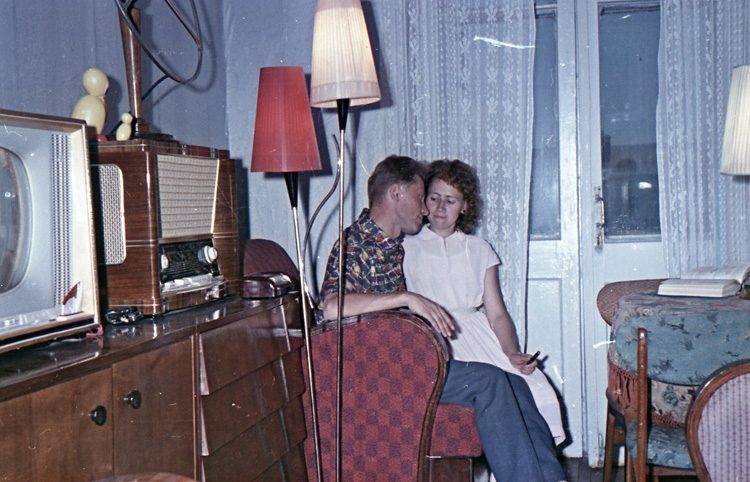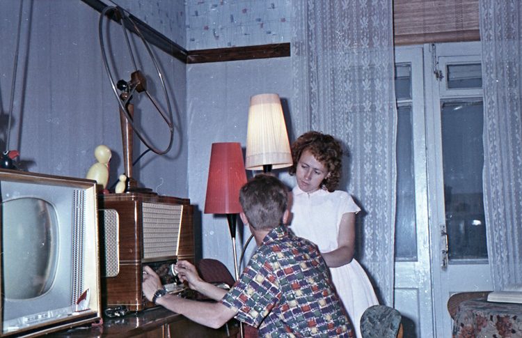 это от начала и до конца современное постановочное фото… в одну комнату притащили все, что нашли на блошинке… не могла мебель 60г. выпуска в 60г. быть такой затертой и покоцаной… а тут и радиола и телевизор… только где салфеточки на них? господа… а торшер, люстра и настольная лампа в одной комнате- это просто роскошь… для молодой семьи.