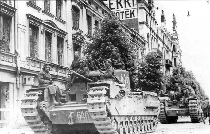 Зенитчики 740-го артполка на бронетранспортерах М-17 на улице освобожденного Данцига.