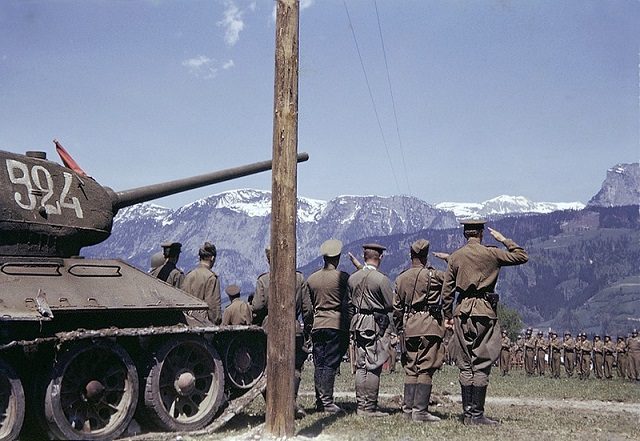1945, Австрия. Советские офицеры у танка Т-34-85 салютуют параду 9-й бронетанковой дивизии армии США в районе Линца