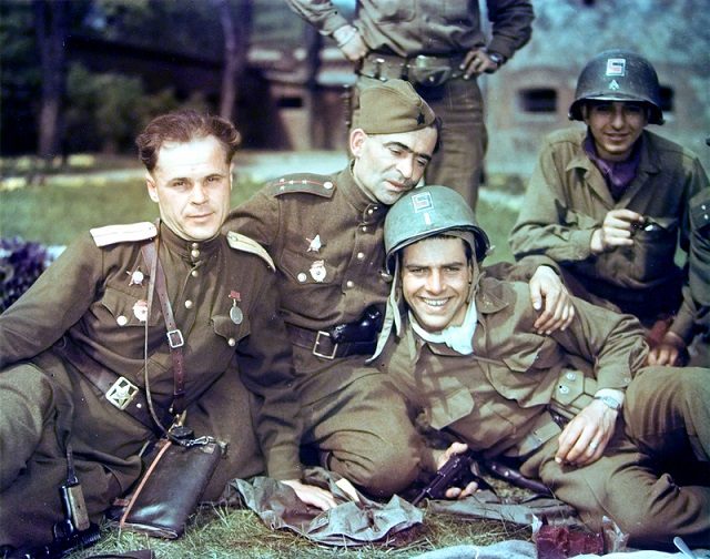 Советские офицеры и американские военнослужащие во время встречи на Эльбе