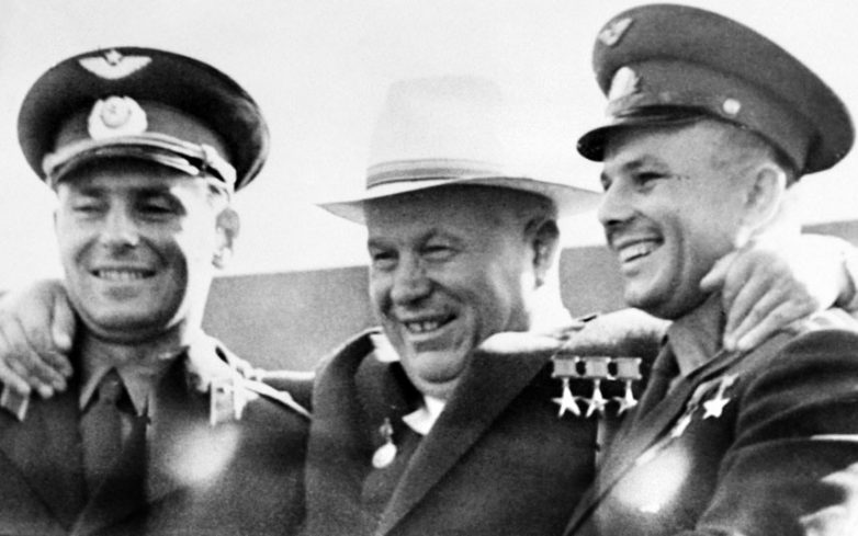 Советский лидер, генеральный секретарь Никита Хрущев обнимает космонавтов Германа Титова и Юрия Гагарина после того, как Титов стал вторым человеком, который побывал на орбите нашей планеты. Он провел 25 часов в космосе, став первым человеком который спал, находясь на орбите. Титову во время полета было всего лишь 25 лет, он остается самым молодым человеком, который когда-либо выходил в космос.