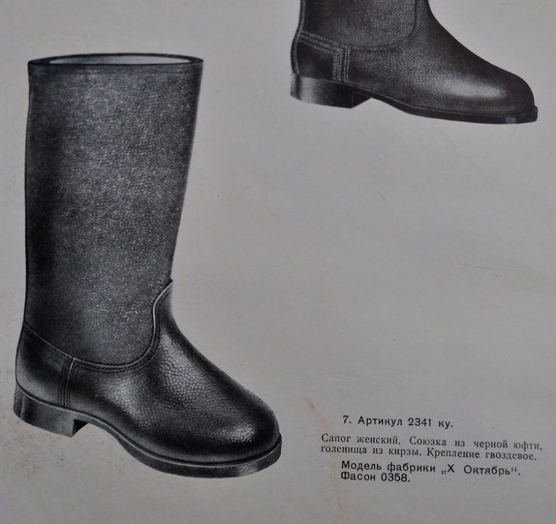 Полусапожки модельные. (в те годы в СССР не выпускали женских модельных сапог из-за дороговизны производства, их стали выпускать позже. Очень мало их выпускали в те годы и на Западе. Говорят, что в те годы приличной женщине тогда ходить в сапогах было непристойно.)