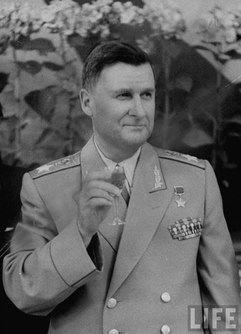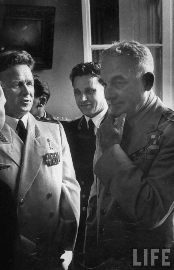 Начальник штаба ВВС СССР Леонид Григорьевич Руденко беседует с бригадным генералом Натаном Твинингом на приеме, организованном после авиашоу в клубе Красной Армии