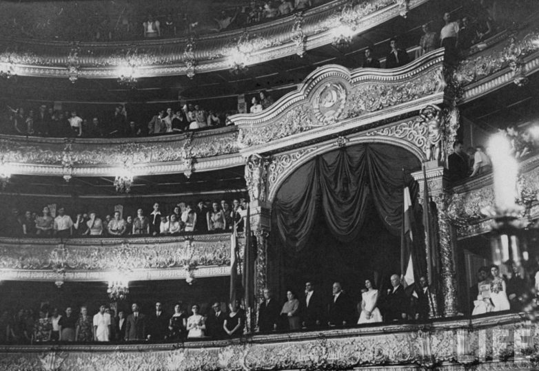 Климент Ворошилов, Никита Хрущев, Николай Булганин в Большом театре вместе с королем Мохаммедом Реза-шахом и его женой королевой Сорейей Эсфандияри
