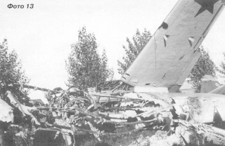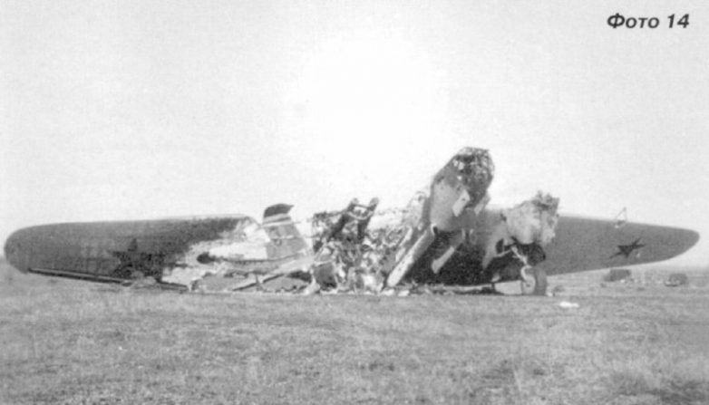 На следующем снимке хорошо виден разбитый при бомбардировке аэродрома СБ, окрашенный по схеме «зеленый верх, голубой низ». Он имеет белый хвостовой №2 и характерную «пилотку» красного цвета. Перед ним — обломки еще одного СБ в светлой окраске (фото №13). Сгоревший СБ с хвостовым номером «3» (фото №14) также, судя по всему, получил прямое попадание авиабомбы.