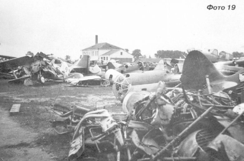 На фотографии хорошо видно, что самолеты стоят вдоль дороги, по порядку: Пе-2 с отстыкованными плоскостями и снятыми двигателями; светло-серый СБ без плоскостей, за его кабиной просматриваются стойки шасси И-16 (без двигателя и плоскостей) и И-15бис (также без двигателя и крыльев); светло-серый СБ с тоннельными радиаторами и прислоненными к нему плоскостями Пе-2, далее И-153 (с ободранной обшивкой фюзеляжа и без плоскостей), за ним стойки шасси, явно принадлежащие И-15бис; Далее три Су-2 (окрашены по схеме «зеленый верх, голубой низ»), за ними виднеется киль И-16 (с номером 5); далее ДБ-Зф (светло-серый, хвостовой № 11) и за ним еще один светло-серый СБ.