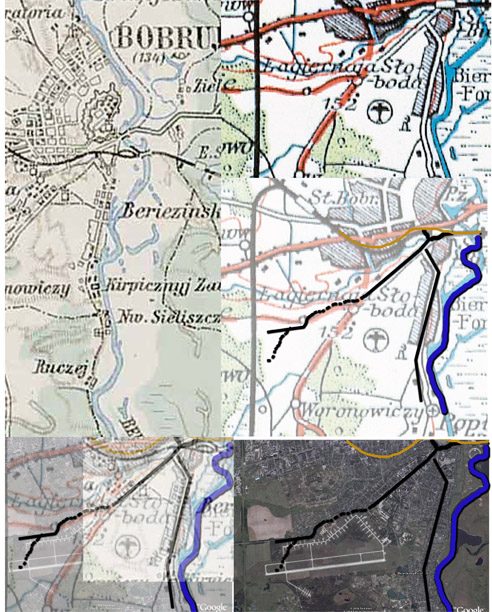 Расположение аэродрома г.Бобруйск на картах 30-х годов и снимке наших дней сделанного со спутника. К сожалению до сих пор не удалось точно привязать на местности выявленные постройки и ангары, вполне возможно что здания не пережили войны и в послевоенные годы были снесены.