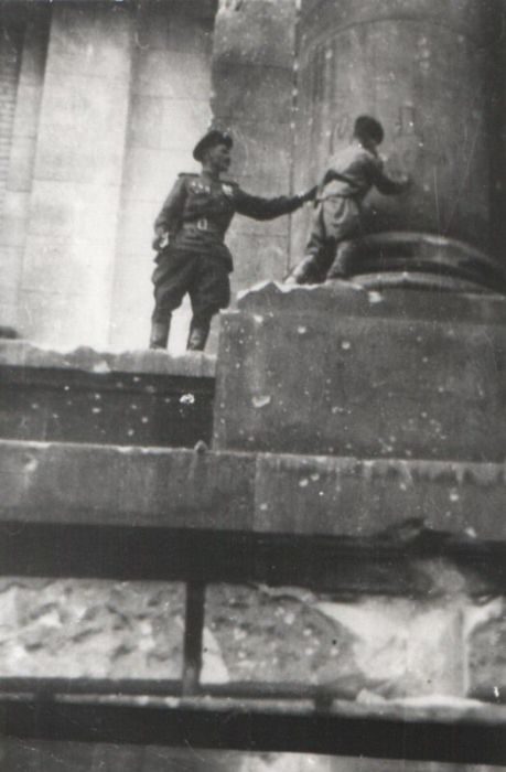 кто там флаг ставит над рейхстагом не Егоров ли? у меня бы голова закружилась и коленки затряслись на такой высоте стоять. Сильные и мужественные люди прошли труднейшие испытания жизни с 1941 по 1945 г., эх мне б в то время и я хотел быть таким отважным и сильным человеком.