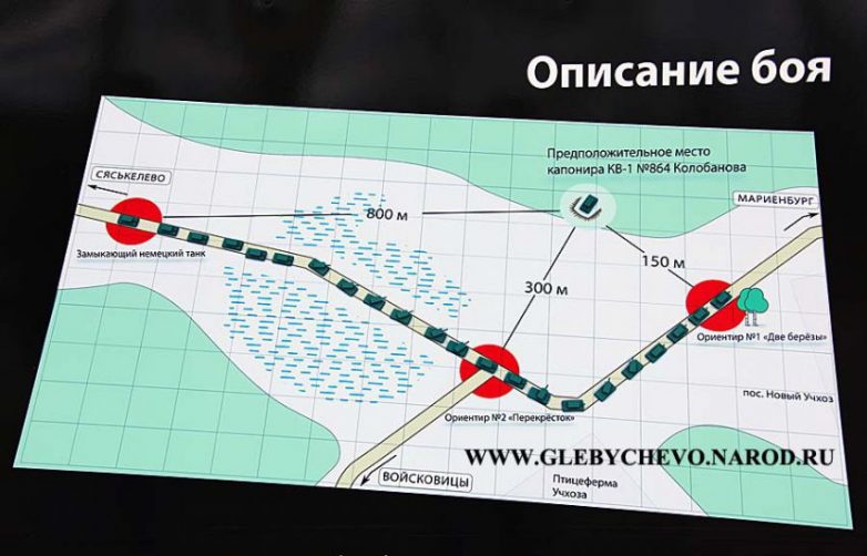 На месте боя экипажа Колобанова с немецкой танковой колонной установлен памятник. На сером, похожем на огромный кирпич пьедестале, стоит тяжелый танк ИС-2, прошедший послевоенную модернизацию. Видимо, авторам монумента не удалось отыскать КВ-1*. Впрочем, уже тогда, а тем более сейчас, найти танки подобного типа было практически невозможно. Поэтому на постамент поставили «ИС». Ведь он тоже кировский (хотя и из Челябинска), да и внешним видом, хотя бы ходовой частью, похож на КВ. Памятные доски, прикрепленные к постаменту, напоминают о том, что произошло здесь в августе 1941 года.