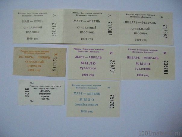 Талоны на продукты питания и некоторые товары народного потребления получались по месту прописки в ЖЭУ (или общежитии — для студентов ВУЗов), на другие товары народного потребления талоны получались по месту работы (обычно, в профкоме).
