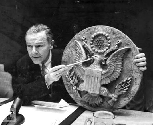 Речь вовсе не о насекомых, хотя не исключаем, что и последние частенько подрывали работу сотрудников в подлежащем реконструкции здании. Вырезанный вручную большой деревянный герб Соединенных Штатов, который 9 февраля 1945 года советские дети подарили послу Авереллу Гарриману, был размещен в его кабинете.